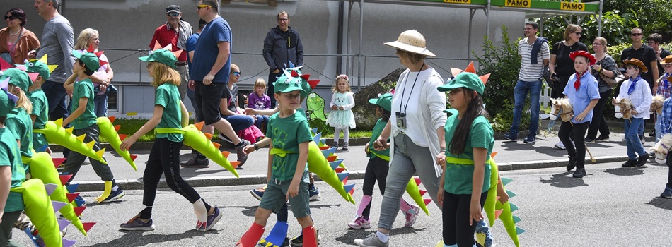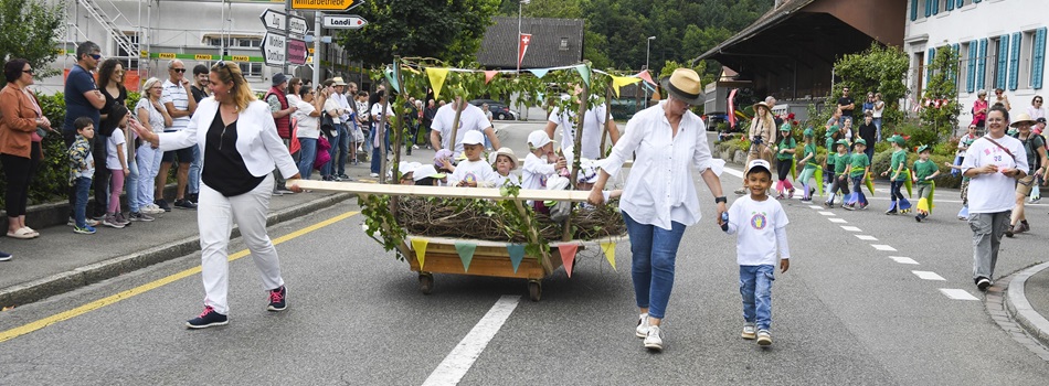Der farbenfrohe Umzug erfreute die Zuschauenden, die den Strassenrand säumten. Die teilnehmenden Vereine, der Gemeinderat, das OK und die Schule wurden musikalisch begleitet und boten ein prächtiges Bild.